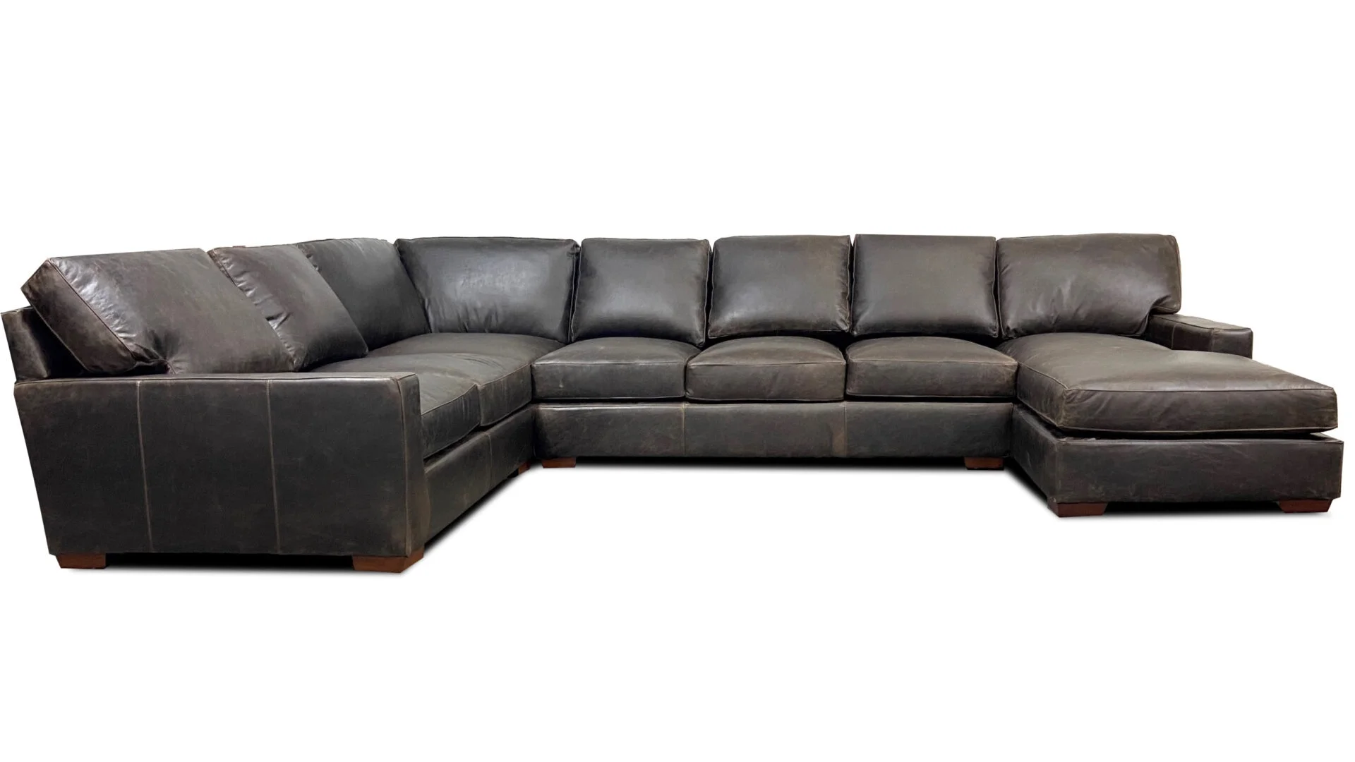 This stunning sectional sofa is the perfect centerpiece for any living room, offering ample seating for 7-8 people. The traditional and industrial design styles blend together seamlessly, creating a unique and sophisticated look that's sure to impress. The solid leather upholstery in a rich Java Ancient color adds a touch of warmth and elegance, while the track arms provide a sleek and modern contrast.