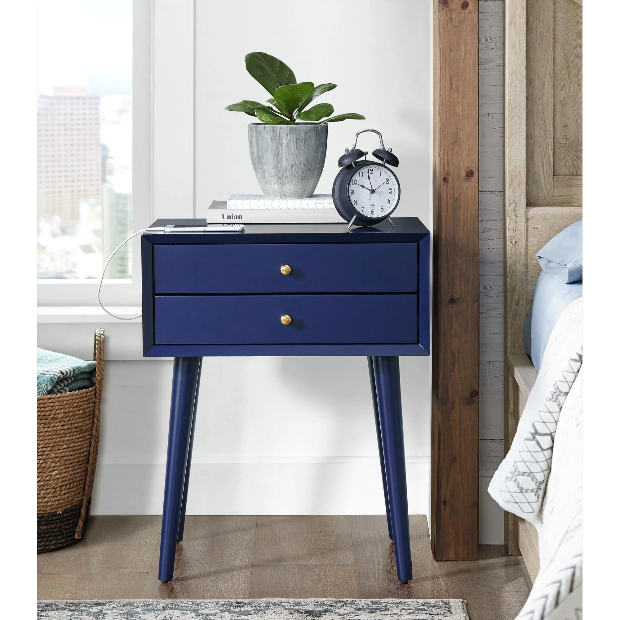 Iconic Mid-Century Angled Legs, Two Spacious Drawers with Gold Metal Knobs, Felt-Lined Drawers, Ball Bearing Glides, Features USB Port with Power Outlet, Beveled Edges