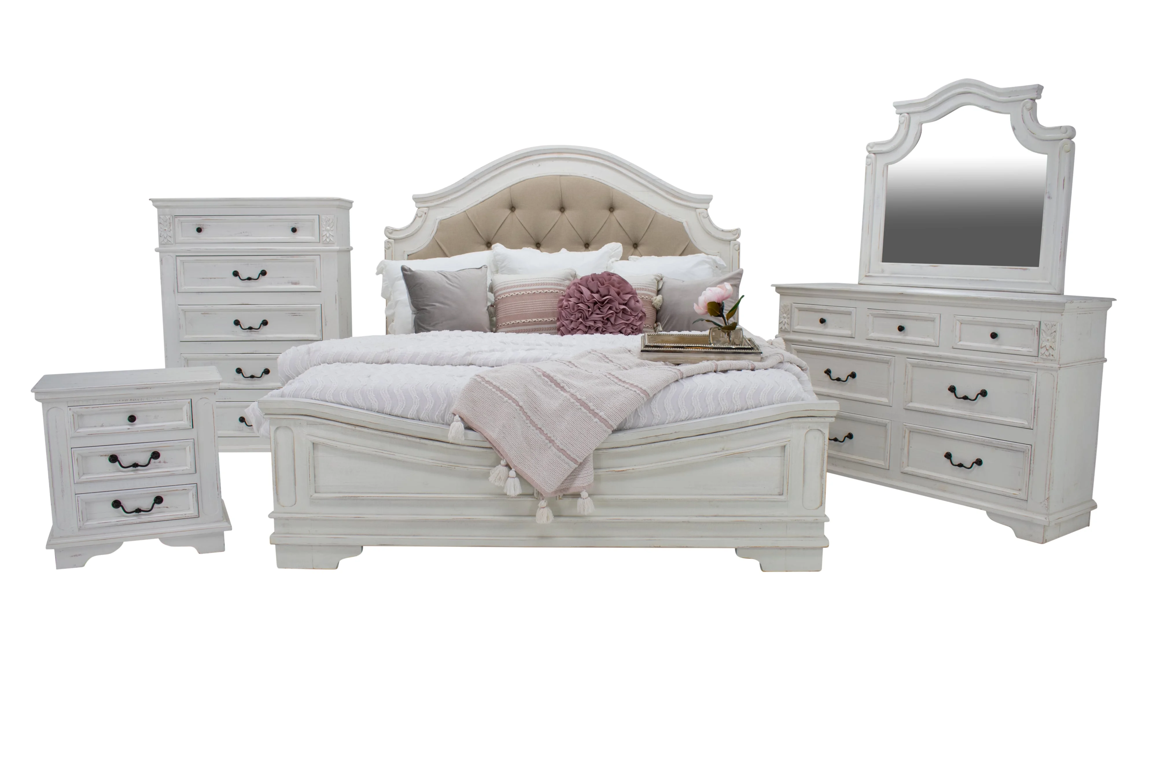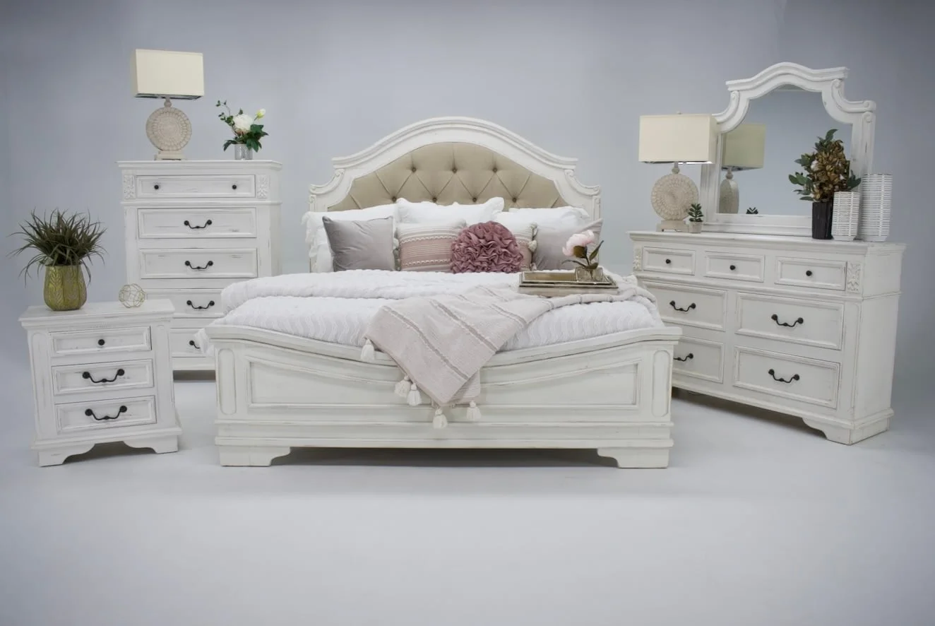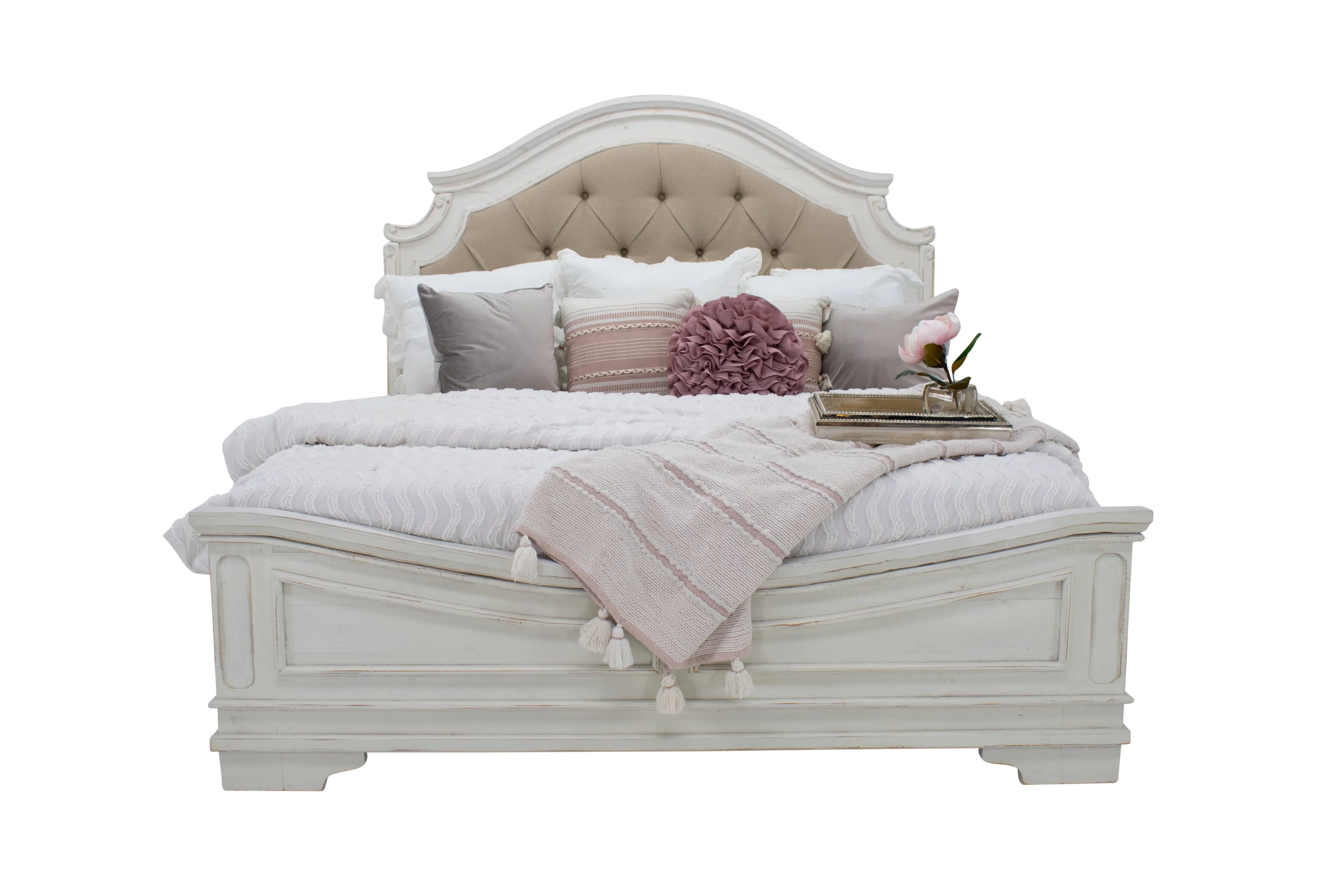 Elevating the art of traditional cottage styling, the Freedom set is your dream bedroom retreat realized. A curvaceous beauty, this brilliant upholstered bed wows with dramatic scalloped details and fanciful trim work and charms with a distressed chipped white finish for heirloom appeal. Deep tufting on the cushioned upholstered headboard adds such a cozy element sure to put you at ease!
