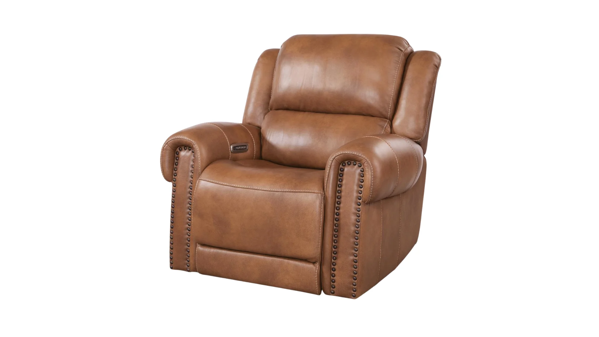 The recliner's hidden release mechanism, located inside the arm, allows for effortless reclining with the touch of a button, making it easy to find your perfect position. Upholstered in high-quality leather, this recliner features a solid pattern in a rich Cordoba-Cognac color that adds warmth and sophistication to any room.