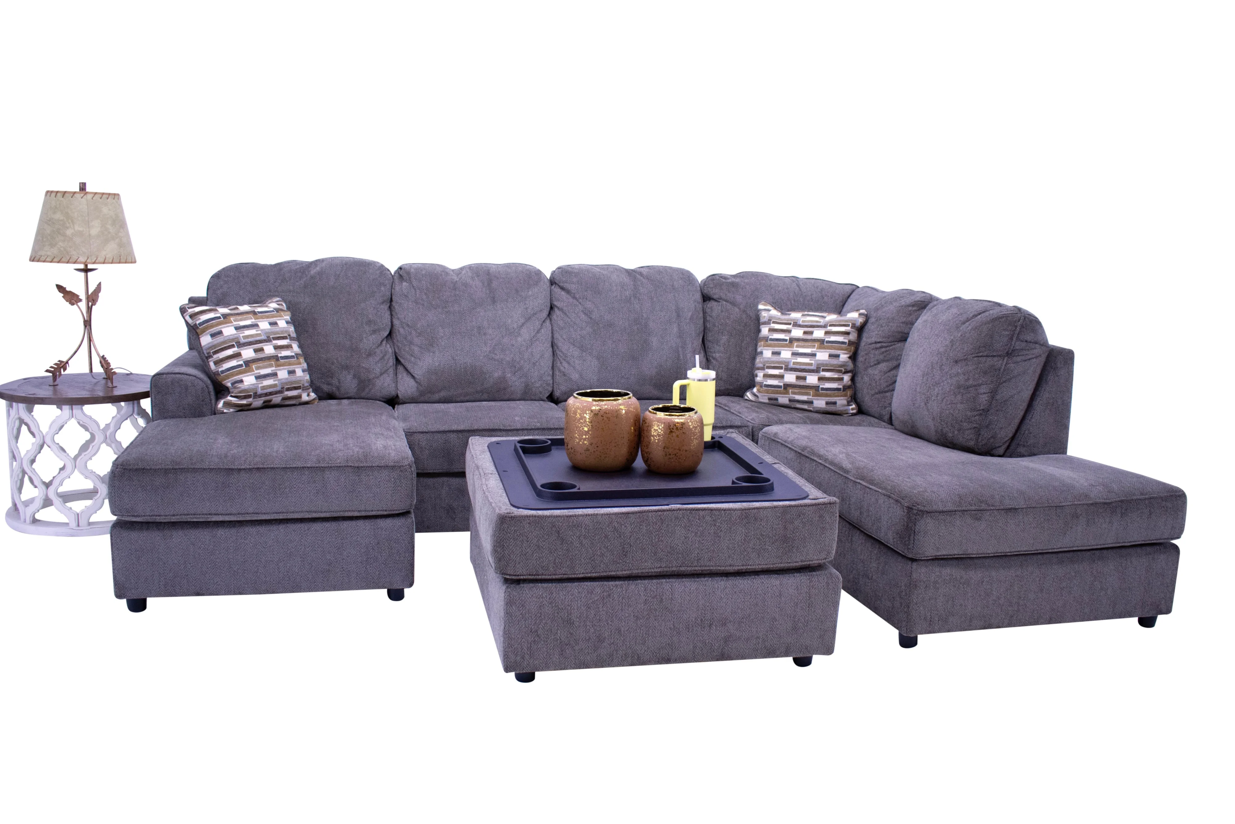 Storage under cushioned, removable top. Built-in tabletop/cup holders on reverse side of removable cushion. High-resiliency foam cushion wrapped in thick poly fiber.