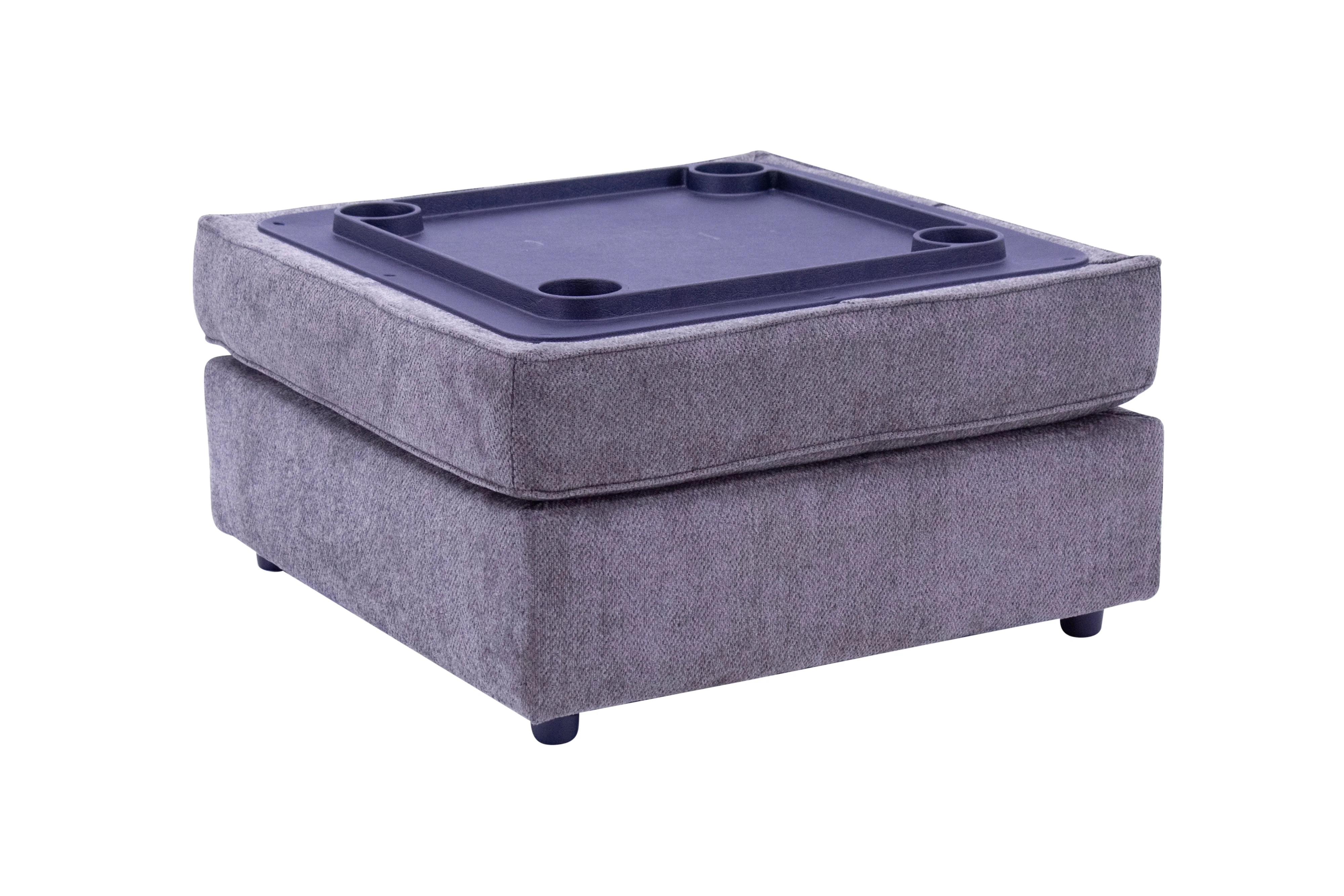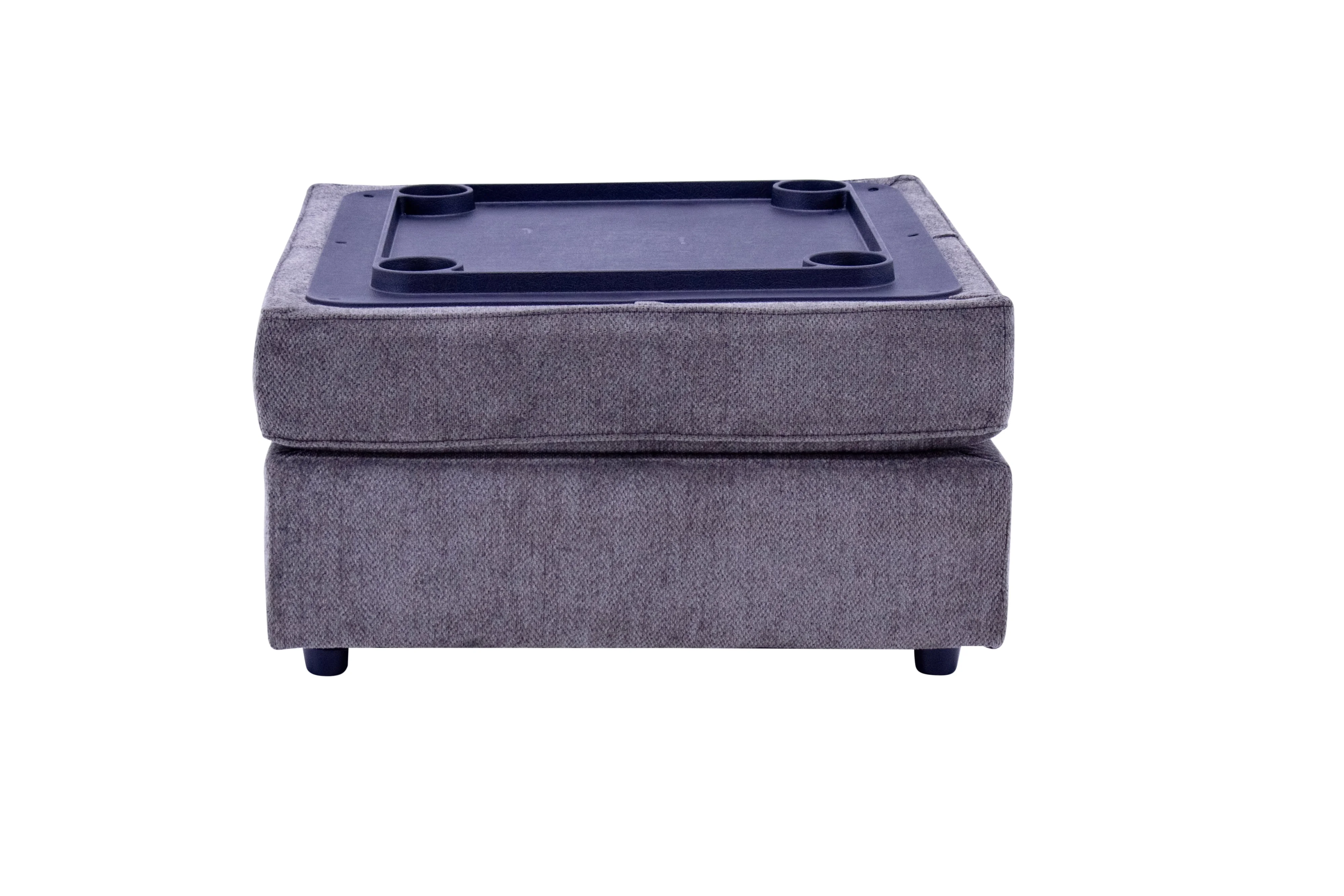 - Storage under cushioned, removable top. Built-in tabletop/cup holders on reverse side of removable cushion. High-resiliency foam cushion wrapped in thick poly fiber.